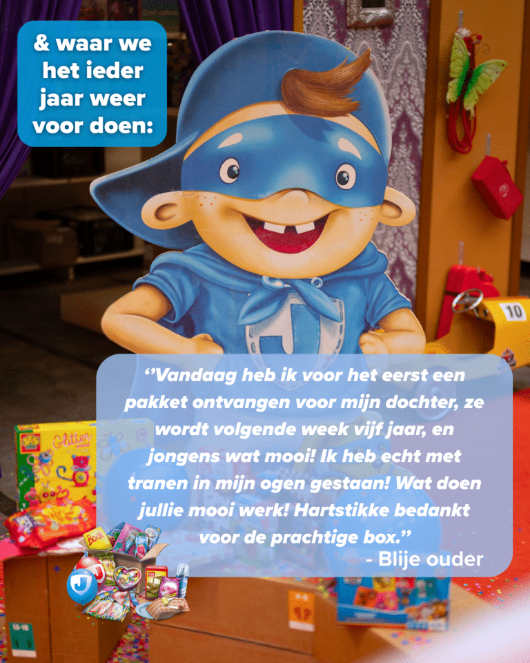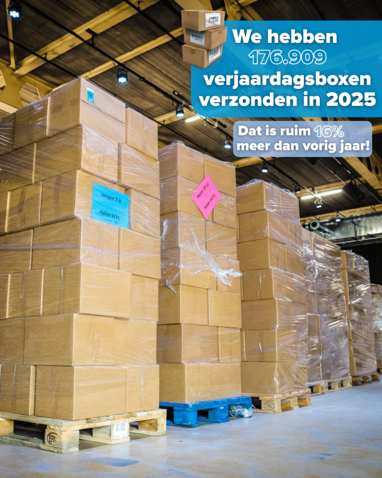 In 2026 willen we nóg meer gezinnen helpen, nóg meer cakemixen versturen, nóg meer leesboeken cadeau geven en nóg meer kinderen laten trakteren op school. Dat kunnen we alleen samen en we hopen dan ook dat iedereen ons volgend jaar opnieuw wil helpen om dit mogelijk te maken.