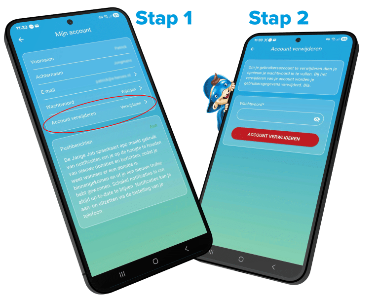 Ga in de app naar “Mijn account” en klik op “Account verwijderen”. Na het invoeren van je wachtwoord worden direct al je gegevens uit de database verwijderd. Gegevens qua statistieken worden per direct geanonimiseerd, zo zijn al jouw gegevens veilig verwijderd